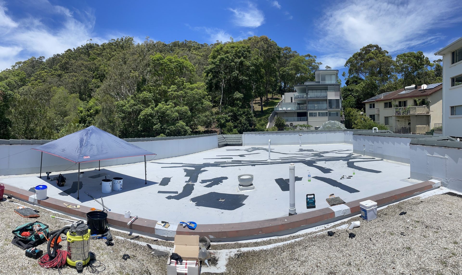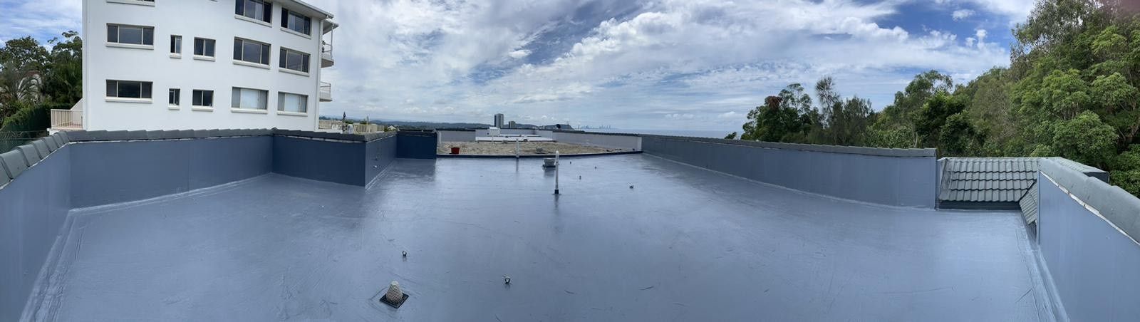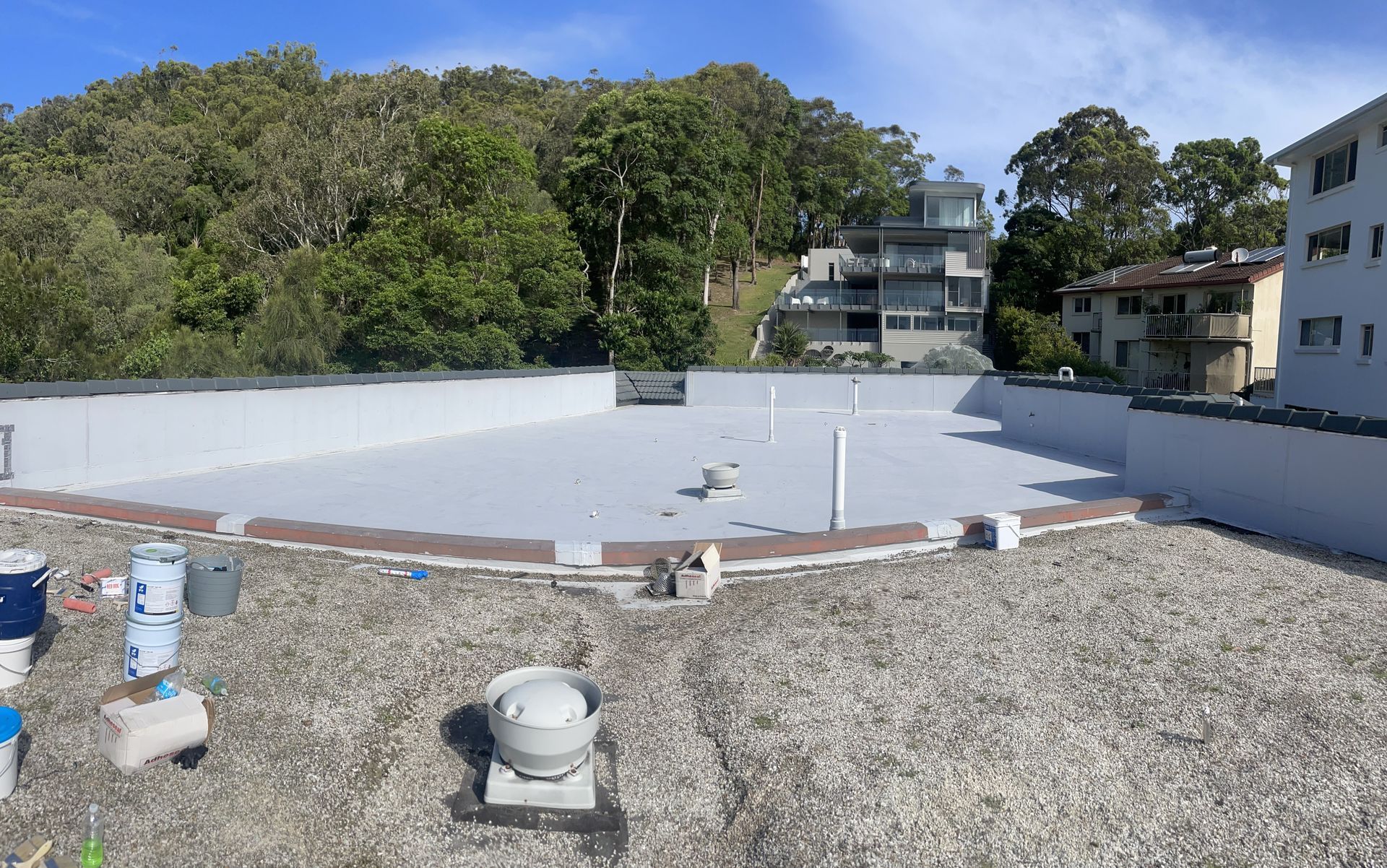 National Construction & Remedial (NCR) were contracted to remove and replace the existing tiles, dividing fence and roof membrane from a Broadbeach apartment building. This job required more planning and coordinating due to the logistics of getting 200m2 of tiles and membrane, as well as a dividing wall off the rooftop. The NCR solution was to use a crane. The 200m2 of tiles and membrane was removed and loaded into crane safe bags and were lifted off the roof by a crane. To maximise time and money for our client we managed to utilise the crane to lift up the new tiles, grout, screed, waterproofing membrane materials and the new fence panels. The NCR team coordinated hire of the crane and traffic control, as well as ensuring the council permit and police permits were organised. To combat water pooling issues on the roof, the NCR team created fall and drainage to move the rain water off the roof. A new polyurethane waterproofing membrane was applied. The roof top was finished off with modern neutral grey tiles and a white aluminium louver angled fence to divide the two apartments with roof top access.