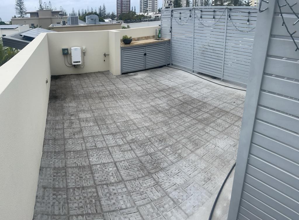 National Construction & Remedial (NCR) were contracted to remove and replace the existing tiles, dividing fence and roof membrane from a Broadbeach apartment building. This job required more planning and coordinating due to the logistics of getting 200m2 of tiles and membrane, as well as a dividing wall off the rooftop. The NCR solution was to use a crane. The 200m2 of tiles and membrane was removed and loaded into crane safe bags and were lifted off the roof by a crane. To maximise time and money for our client we managed to utilise the crane to lift up the new tiles, grout, screed, waterproofing membrane materials and the new fence panels. The NCR team coordinated hire of the crane and traffic control, as well as ensuring the council permit and police permits were organised. To combat water pooling issues on the roof, the NCR team created fall and drainage to move the rain water off the roof. A new polyurethane waterproofing membrane was applied. The roof top was finished off with modern neutral grey tiles and a white aluminium louver angled fence to divide the two apartments with roof top access.