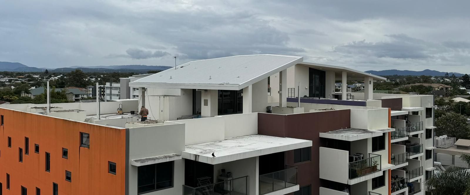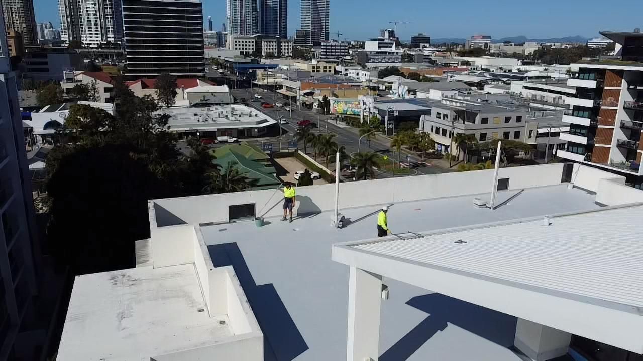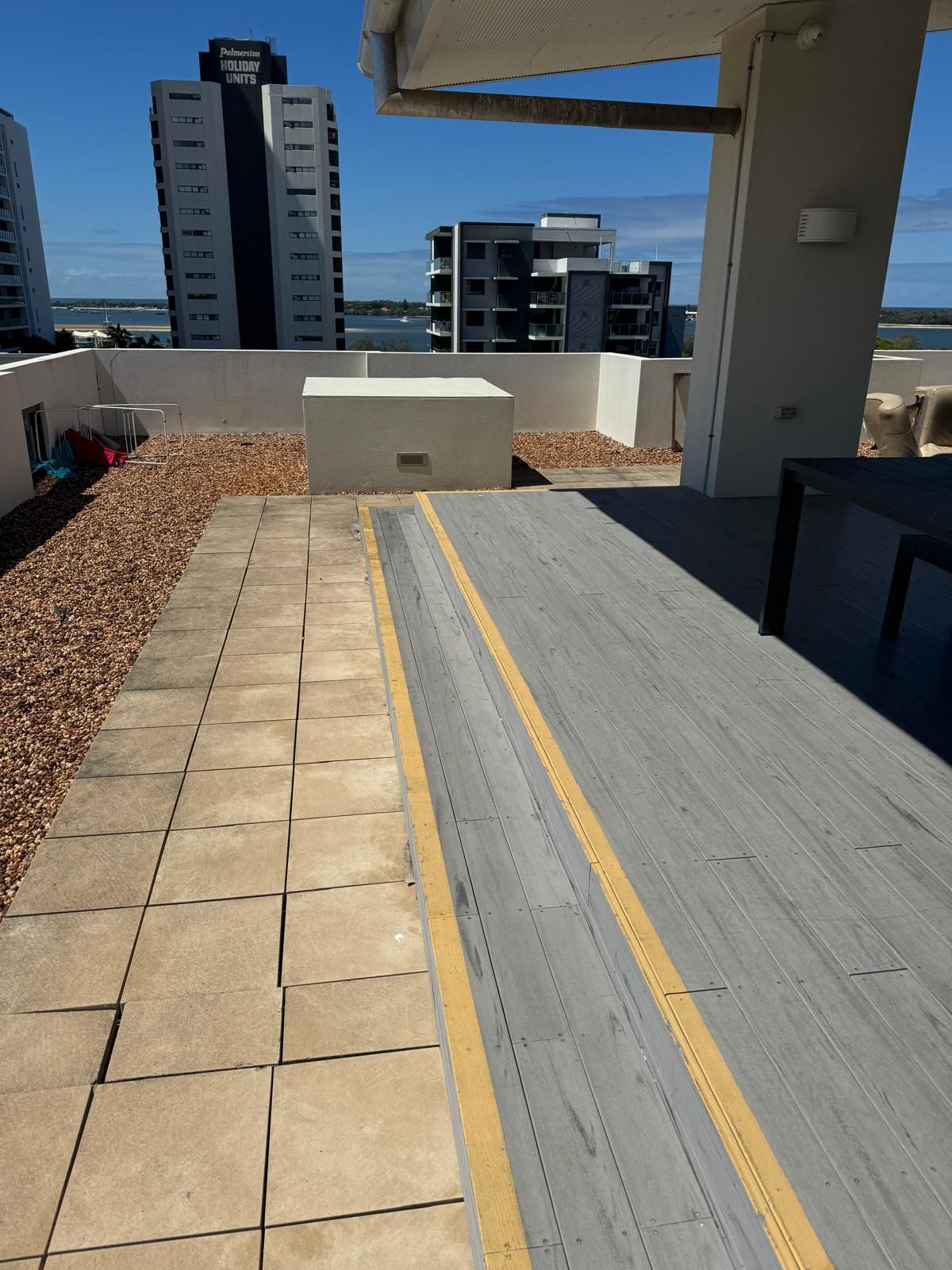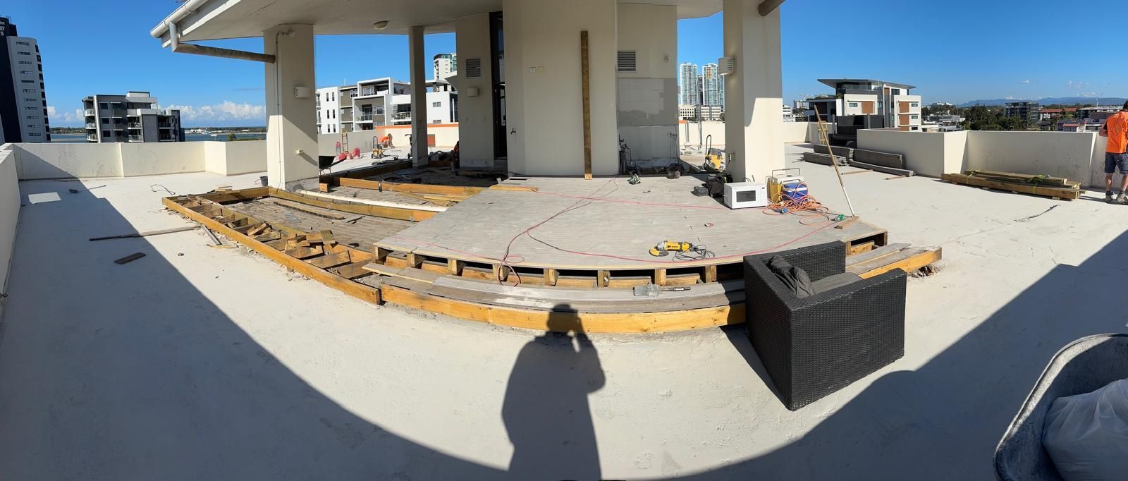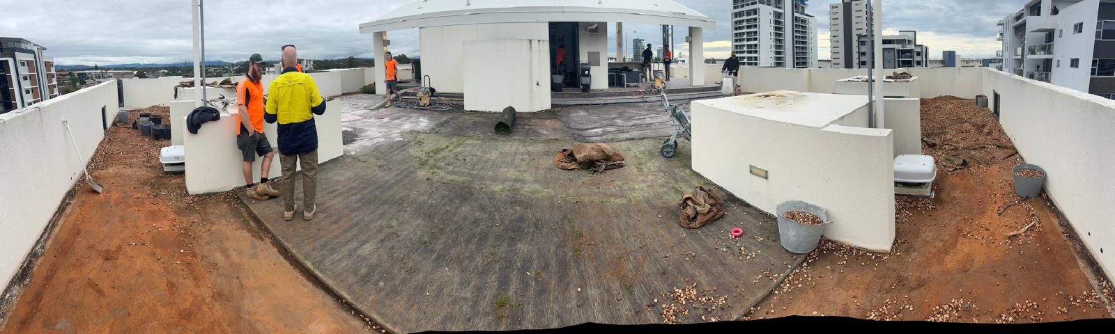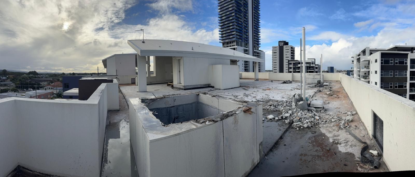 National Construction & Remedial (NCR) were contracted to remove and replace the existing tiles, dividing fence and roof membrane from a Broadbeach apartment building. This job required more planning and coordinating due to the logistics of getting 200m2 of tiles and membrane, as well as a dividing wall off the rooftop. The NCR solution was to use a crane. The 200m2 of tiles and membrane was removed and loaded into crane safe bags and were lifted off the roof by a crane. To maximise time and money for our client we managed to utilise the crane to lift up the new tiles, grout, screed, waterproofing membrane materials and the new fence panels. The NCR team coordinated hire of the crane and traffic control, as well as ensuring the council permit and police permits were organised. To combat water pooling issues on the roof, the NCR team created fall and drainage to move the rain water off the roof. A new polyurethane waterproofing membrane was applied. The roof top was finished off with modern neutral grey tiles and a white aluminium louver angled fence to divide the two apartments with roof top access.
