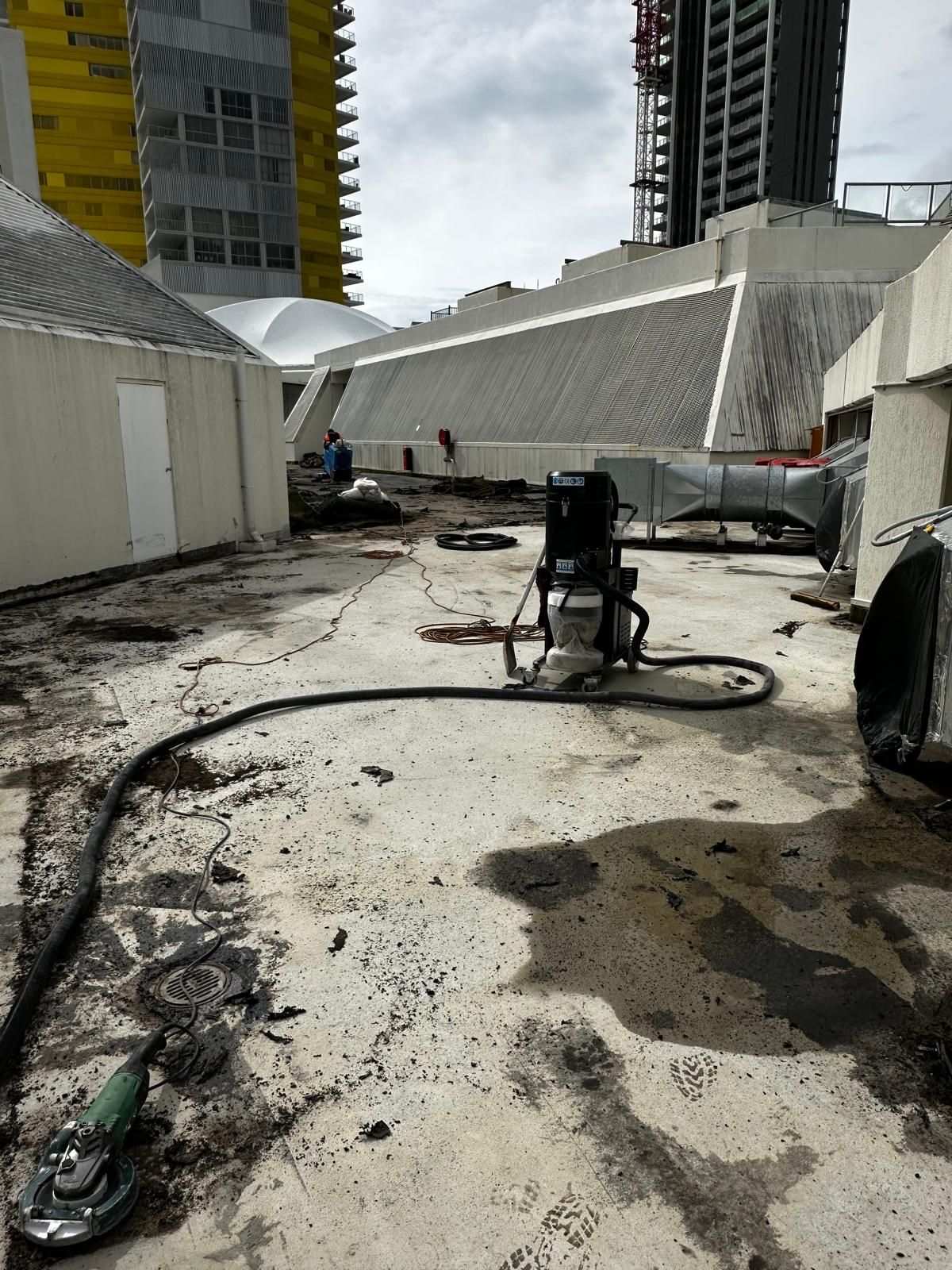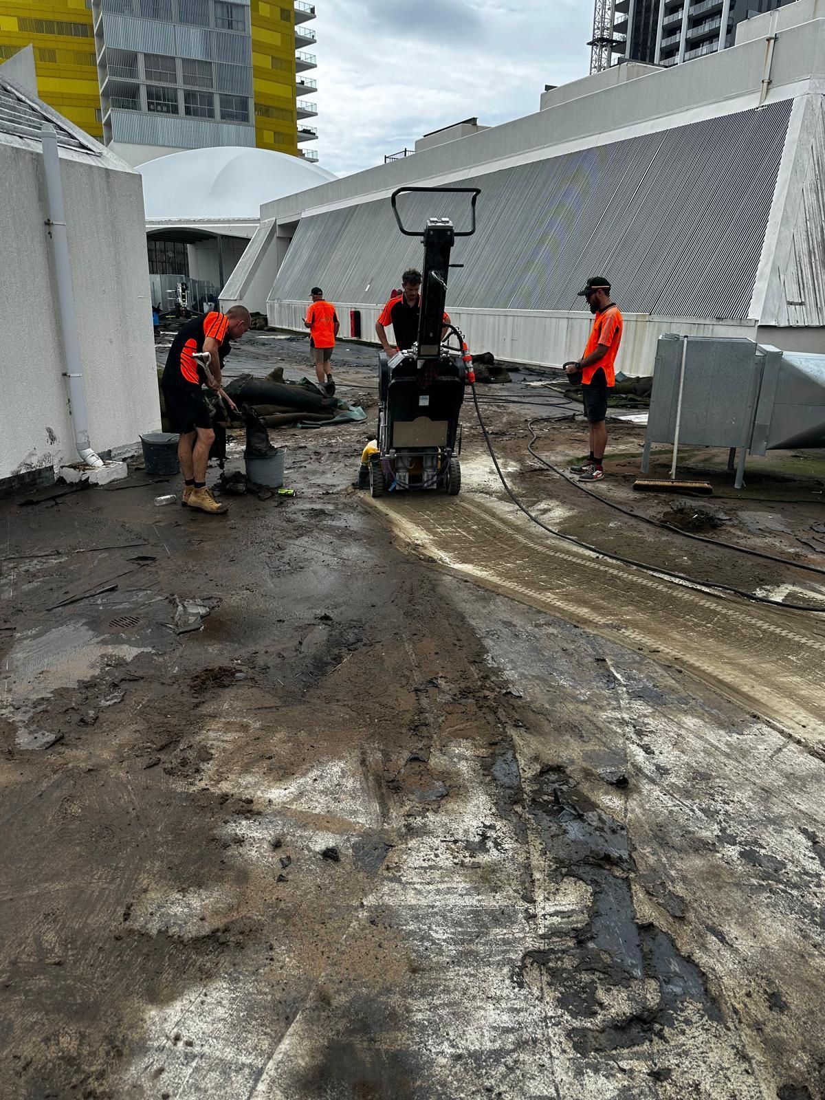 Works included full removal and disposal of existing membranes and coatings, mechanical surface preparation back to sound concrete, and repair of cracks and concrete defects. All control and expansion joints were replaced using the ARDEX jointing system with backer rod installation. Waterproofing was completed using the ARDEX WPM system across the podium surface, penetrations, drainage points and planter boxes.